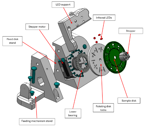 The sample disk is placed on a rotating table at a 60° inclination relative to the horizontal plane and fastened to it using five M2 screws. The sample disk and table are rotated by a stepper motor that fastened to the fixed disk stand with screws. The sample disk assembly is constrained by an axial bearing on its lower side and by a mechanical stopper placed on the end of the motor shaft on the upper side. The coupling between the stepper and the PCB table is assured by a slit in the motor’s shaft.
