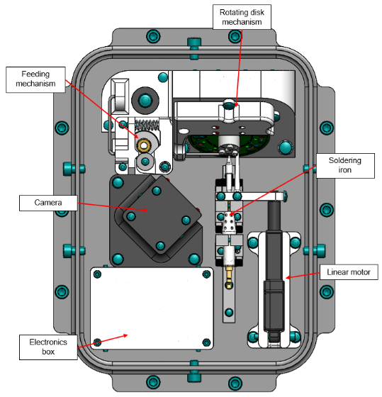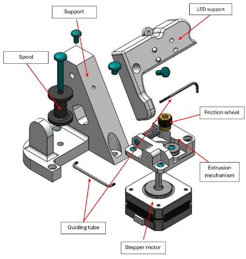 The feeding mechanism is similar to the extruder of a 3D printer and comprises two wheels, one which is rotated by a stepper motor, 2 guiding tubes and a spool for the soldering iron. The spool was designed immobile since the soldering wire is not longer than 20 cm. The soldering wire is winded on the spool, threaded through the feeding tube and pushed forwards by the adjustable feeding gears. The first gear is directly situated on the motor shaft, the second one is screwed down on the feeding gears support. A rigid spring is used to adjust the feeding gears, in order to reach the needed friction for an efficient movement of the soldering wire through the feeding mechanism. At this moment, the passing of the soldering wire through basic 3D printer gears seems possible, although further testing is needed. A backup plan is prepared, using gears with sharp teeth to compensate for the material’s malleability. The guiding tubes will be threaded and fixed on the support in order to efficiently block their movement. The tube will also have a groove through which the position of the soldering wire in the tube can be monitored.