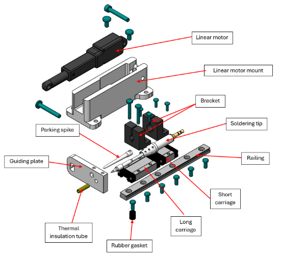 The soldering iron is mounted on a railing in a horizontal position, at a 30° angle with the sample disk, which is an adequate configuration for the formation of high-quality through- hole solder joints. The soldering iron is fixed on two carriages. The small carriage supports the rear end and it is fastened to the soldering iron using brackets. The big carriage supports the front end of the soldering iron and the guiding plate. The guiding plate is a plane that is securely affixed to both the big carriage and the linear motor. This configuration ensures that when the linear motor initiates translational movement, it pushes the guiding plate, consequently propelling the soldering iron in tandem until it is in contact with the sample disk. The soldering iron’s front end reaches a temperature of 100-200°C, thus it is thermally insulated in the contact point with the guiding plate using a silicone insulating tube. This insulation is preferred to avoid the conduction of heat through the guiding plate and to the linear motor and railing.